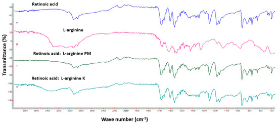 FTIR spectra of Ret, arginine, Ret:arginine PM, and Ret:arginine K.