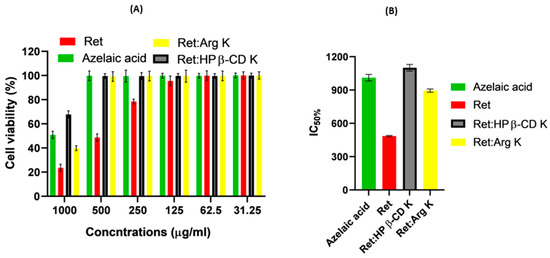 The cell viability (%) estimated for Ret at concentrations of 500 and 1000 µg/mL were the lowest (48% and 23%, respectively) among the studied control azelaics, Ret:HP β-CD K and Ret:arginine K (Figure 14A). These results indicated that retinoic acid could pose an irritation potential when applied to the skin. Retinoic acid is available in topical creams at strengths of 0.025% to 0.1% to demonstrate that these doses are clinically relevant. On the contrary, azelaic acid recorded significantly (p < 0.05) higher cell viabilities (%) of 100% and 51%, respectively, at the same concentrations. More interestingly, the cell viability recorded for Ret:HP β-CD K and Ret:arginine K was significantly increased compared to that for Ret alone. The IC50% recorded for azelaic acid, Ret, Ret:HP β-CD K, and Ret:arginine K were 1000, 485, 1100, and 895 µg/mL, respectively (Figure 14B). The two carriers (HP β-CD and the amino acid arginine) were able to reduce the irritation potentials of Ret. Similar results were recorded for cyclodextrins and diclofenac sodium. The ocular irritation potential and corneal epithelial cell toxicity (%) were significantly reduced by the diclofenac/cyclodextrin inclusion complexes [26]. The inclusion of Ret in the CD pockets could reduce direct contact of the drug with the skin tissue and lessen the local high concentrations of the applied drug [2]. Similarly, the Ret/arginine ion pair complex could also neutralize high local acidity and penetration into the skin.