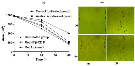 Scratch assay analysis: gap area versus time profiles for Ret and different formulations (A); representative micrographs (B) of the scratch size at zero (i) and 48 h (ii) for control (a) and Ret:HP β-CD K (b).