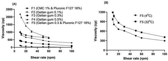 Rheological profiles of retinoic acid-based gels (A) for gel formulations F1–F5 and (B) for F5 at 4 °C and 32 °C.