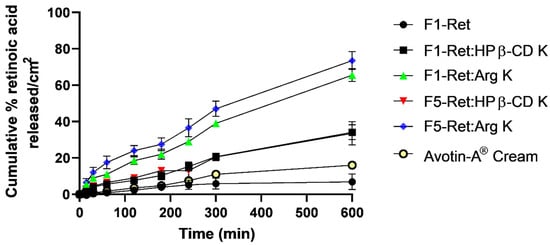 The in vitro release profiles of retinoic acid from the selected gel formulations are the F1 and F5 gels loaded with the drug alone, Ret:HP β-CD K, Ret:Arg K, and Avotin-A cream (Figure 17). The rate and extent of drug release from F1-Ret were extremely low. There are slight but not significant release rates of the drug from the cream formulation. Approximately 10% of the drug was released over 600 min and 300 min (Q10% was >600 min and 300 min) for F1-Ret and the Avotin-A cream, respectively. On the contrary, faster and greater extents were released from the Ret:HP β-CD K- and Ret:Arg K-loaded gel formulations. These results could be ascribed solely to the solubility of Ret in the tested formulations. Ret is a class II drug, and it shows solubility-dependent release rates [29]. The release rates and extents were obviously dependent on drug solubility. For example, F1-Ret showed the slowest release rate and the lowest amount released of the drug. This is because the drug was suspended in the gel matrix and more time was required for the drug to first be dissolved in the diffusion layer before its release from the polymeric matrix. On the other hand, both release rates and extents were significantly greater than the more soluble forms Ret:HP β-CD K and Ret:Arg K. More interestingly, greater dissolution rates and extents for F1-Ret:Arg K and F5-Ret:Arg K than F1-Ret:HP β-CD K and F5-Ret:HP β-CD K could be attributed to the proportional increases in solubility enhancement. The greater the solubility enhancement factor, the better the dissolution rates recorded. Both Q25% and RDR60min for HP β-CD K and Ret:Arg K were recorded (600 min and 240 min) and (5.5 and 11), respectively. A slight but non-significant improvement in the dissolution rates was recorded for the Avotin-A cream compared to F1-Ret. This could be ascribed to the higher affinity of the lipophilic drug to the cream base than partitioning out to the aqueous release media. It is worth mentioning that the release rates and extent of retinoic acid of Ret:HP β-CD K and Ret:Arg K from F5 were markedly greater than those from F1. This could be attributed to the greater viscosity of F1 than F5, and hence, the time for drug diffusion out of F1 was longer than that taken to diffuse out of F5 (the less viscous polymeric matrix); see Table 3. The mechanism of drug release from the investigated systems was fitted into the Korsmeyer–Peppas equation. The release kinetic constants correlated well with the release parameters, where the lowest drug release constant was recorded for F1-Ret and the highest release constant was attributed to F5-Ret:Arg K (Table 3). The release exponent for F1-Ret:HP β-CD K and F5-Ret:HP β-CD K, and F1- and F5-Ret:Arg K as well as Ret:Arg K was 0.5 < n < 0.89, indicating a general release mechanism of coupled erosion and diffusion, while F1-Ret and the Avotin-A cream recorded n > 1, indicating a super case II-type release mechanism [30].