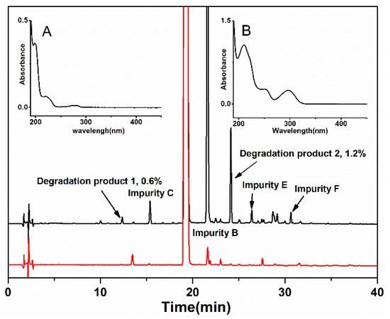 Chromatograms of the photodegraded sample (black line) and normal sample (red line) were obtained from the sodium 1-heptanesulfonate chromatographic system. Inset: UV spectra of degradation product 1 (A) and degradation product 2 (B) extracted from the sodium 1-heptanesulfonate chromatographic system.