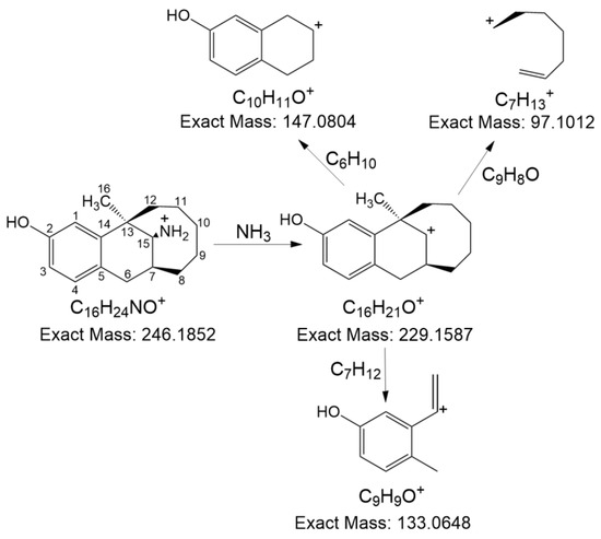 The sample of degradation products 1 and 2 was prepared using the preparative LC method. After freeze-drying and redissolving in deionized water five times, approximately 40 mg of degradation product 1 and 70 mg of degradation product 2 were obtained. Firstly, the structure of dezocine was confirmed by high-resolution MS. As shown in Figure S1, dezocine provided a protonated molecule [M+H]+ at m/z 246.18433, indicating the elemental composition was C16H24NO+. Figure 2 shows the MS fragmentation pathway of dezocine. Further confirmation was achieved through the 1H NMR, 13C NMR, 1H–1HCOSY, HSQC, and HMBC spectra (Figures S2–S6). The 1H NMR and 13C NMR data of dezocine are listed in Table 1. Note that the two degradation products (i.e., degradation product 1 and degradation product 2) were only found in dezocine injection instead of the active pharmaceutical ingredient (API) (i.e., dezocine).