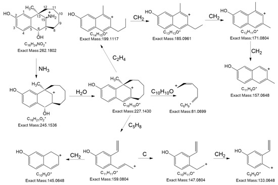 Subsequently, the structure of degradation product 1 was elucidated and validated based on the data acquired on the high-resolution MS and NMR spectroscopy. The results of high-resolution MS indicated that the protonated molecule [M+H]+ of degradation product 1 was 262.17896 (Figure S7), which was 16 m/z units higher than the protonated molecule [M+H]+ of the dezocine (i.e., 246.18433). Dezocine was structurally similar to morphine. It is reported in the literature that both benzylic and allylic positions exist in morphine molecules, which can undergo the oxidation reaction to produce two types of degradation products [23]. Accordingly, it was speculated that degradation product 1 was the oxidation product of dezocine. Figure 3 shows the structure and MS fragmentation pathway of degradation product 1.