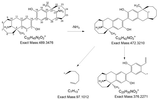 On the other hand, the results of HRMS indicated that degradation product 2 had a protonated molecule [M+H]+ of 489.34546 (Figure S13), and dezocine had a protonated molecule [M+H]+ of 246.18433. Since dezocine contains easy substitution sites (i.e., the ortho-position of phenol hydroxyl structure), it is reported in the literature that morphine with a similar structure could undergo autoxidation to produce carbon–carbon (C-C)-coupled dimers [24]. Therefore, it was speculated that degradation product 2 may be a dimer formed by the loss of two hydrogen atoms from the dezocine. Figure 4 shows the possible structure and MS fragmentation pathway of degradation product 2. The NMR analysis results provided further support for the correctness of the speculated degradation product 2 structure. Analysis of the 1H-NMR data suggests the signal assignments to the following protons on the benzene ring of the dezocine: H1 (δ = 6.60 ppm, 6.59 ppm; doublet), H4 (δ = 6.38 ppm, 6.38 ppm; doublet), and H3 (δ = 6.27–6.28 ppm; quartet). The 1H NMR, 13C NMR, COSY, HSQC, and HMBC spectra of degradation product 2 are presented in the Supplementary Material (Figures S14–S18). Table 1 shows the 1H-NMR and 13C NMR data of degradation product 2. For degradation product 2, the 1H NMR data indicated that it retained the signals of two hydrogens (δ = 6.92 ppm, 6.74 ppm) on the benzene ring. The COSY spectrum revealed an absence of cross-peaks between the two peaks, suggesting that the peaks corresponded to the two hydrogens in the para-position of the benzene ring. By comparing the 1H NMR spectra of degradation product 2 and dezocine, it was also revealed that the two hydrogens in the para-position of the benzene ring of dezocine were retained in degradation product 2. An analysis of the HMBC spectrum indicated that the peak at δ = 115.40 ppm in the carbon spectrum belonged to C2 and C19, and the peak at δ = 131.66 belonged to C13 and C30. In addition, the peak at δ = 153.53 ppm belonged to C1 and C18, each with an attached hydroxyl group. Therefore, degradation product 2 was determined as a dimer of dezocine. These results provide further confirmation of the correctness of the speculated structure of degradation product 2 based on MS. We also studied the degradation of dezocine injections triggered by different conditions (i.e., acid, alkali, heat, and oxidative degradation). The results showed that Impurity B was generated during the degradation process of dezocine injection under alkali conditions or acid conditions. The three conditions (i.e., acid, alkali, and heat degradation) had no effect on the formation of degradation product 1 and degradation product 2. We found that a small amount of degradation product 1 was generated under the oxidative degradation condition.