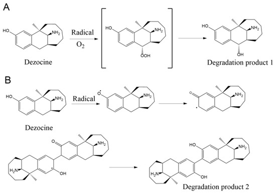 The photodegradation pathways of dezocine including the formation process of degradation product 1 (A) and degradation product 2 (B).