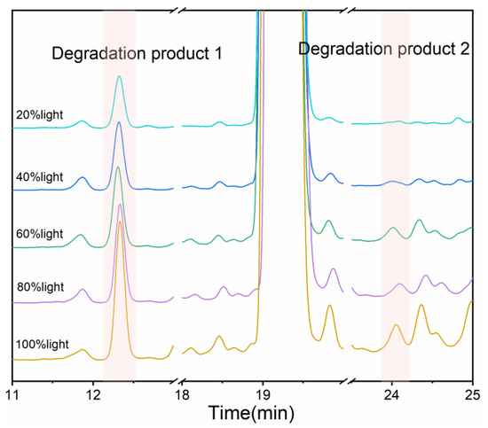 In order to investigate the effect of light intensity and wavelength on the photodegradation of dezocine injection, we monitored the formation process of degradation products 1 and 2 using the HPLC with a PDA detector and the DSC with a light source. The dezocine injection was illuminated for 60 min with full-spectrum light at different light intensities (i.e., 100%, 80%, 60%, 40%, and 20%). After the light irradiation, we immediately detected the amount of the degradation products and the dezocine to evaluate the formation of degradation products and degradation of drugs. Interestingly, few degradation products were produced, and the dezocine almost did not degrade. After 24 h following the exposure of the sample, degradation products 1 and 2 appeared in the dezocine injection. The amount of degradation products 1 and 2 increased with the increase in light intensity. Briefly, with the increase in light intensity from 20% to 100%, the peak area percentage of degradation product 1 increased from 0.157% to 0.456%, and the peak area percentage of dezocine decreased from 99.045% to 90.733% (Figure 6 and Table 2). Degradation product 2 appeared in small amounts only at high-light intensity. In addition, the effect of light wavelength on the photodegradation of dezocine injection was further evaluated using a 320–390 nm (i.e., ultraviolet light) filter (Lumen Dynamics Group Inc., Mississauga, ON, Canada) and 400–500 nm (i.e., visible light) filter (Lumen Dynamics Group Inc., Mississauga, ON, Canada), respectively. The slope of the DSC curve could reflect the rate of the photodegradation reaction [26,27]. The slope of the DSC curve under ultraviolet light was larger than that under visible light (Figure 7), suggesting that the dezocine injection was more sensitive to ultraviolet light than visible light.