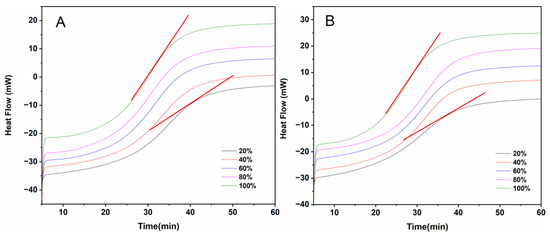 DSC curve of dezocine injection under ultraviolet light (A) and visible light (B) with different illumination intensities.