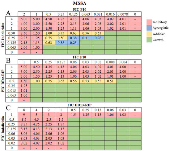 Combinatorial effects of soluble AMPs on MSSA strains. Representative checkerboard assay of fractional inhibitory concentrations (FIC) for (A) indolicidin and P10, (B) DD13-RIP and P10, and (C) indolicidin and DD13-RIP AMP pairs against MSSA. FICs were calculated for each drug (concentration/MIC) and added together for all wells where no growth was observed. The red-colored boxes indicate wells with no bacterial growth (OD600 < 0.1) and green-colored boxes indicate bacterial growth (OD600 > 0.1, Figure S1). The box in the bottom right corner contains no drug and serves as a growth control. Yellow-shaded boxes indicate additive interactions (FICI between 0.5–1.0) and blue boxes indicate synergistic interactions (FICI < 0.5).