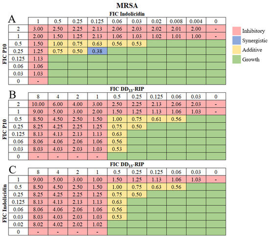Combinatorial effects of soluble AMPs on MRSA strains. Representative checkerboard assay of fractional inhibitory concentrations (FIC) for (A) P10 and indolicidin, (B) P10 and DD13-RIP, and (C) indolicidin and DD13-RIP AMP pairs against MRSA. FICs were calculated for each drug (concentration/MIC) and added together for all wells where no growth was observed. The red-colored boxes indicate wells with no bacterial growth (OD600 < 0.1) and green-colored boxes indicate bacterial growth (OD600 > 0.1, Figure S2). The box in the bottom right corner contains no drug and serves as a growth control. Yellow-shaded boxes indicate additive interactions (FICI between 0.5–1.0) and blue boxes indicate synergistic interactions (FICI < 0.5).