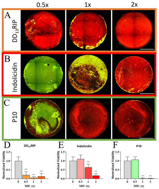 Examination of MRSA biofilm formation on different AMP-loaded hydrogels. Qualitative images of representative AMP hydrogels at 0.5×, 1×, and 2× MIC for tethered (A) DD13-RIP, (B) indolicidin, and (C) P10 AMPs. Scale bars: 1 mm. Quantitative viability analysis of MRSA on (D) DD13-RIP, (E) indolicidin, and (F) P10 AMP hydrogels. All the groups were normalized to the results of a control hydrogel group with no AMP. Significance (*** p < 0.001) in viability was established by comparing each test group to a control hydrogel group with no AMP (0×).