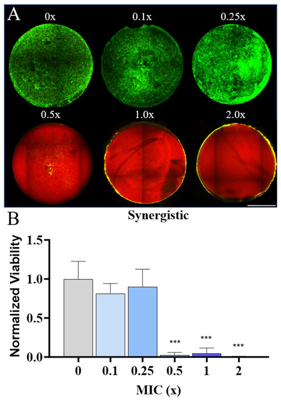 Synergistic effects of P10 and indolicidin on viability of MRSA atop different AMP-loaded hydrogels. (A) Qualitative analysis showing representative hydrogels functionalized with different fractions of the synergistic concentration for indolicidin and P10 (3.125 μM and 12.5 μM, respectively) and stained for live (green) and dead (red) cells. Scale bar: 1 mm. (B) Quantitative analysis of synergistic AMP hydrogel on biofilm viability. Significance (*** p < 0.001) in viability was established by comparing the test group to a control hydrogel group with no AMP (0×).