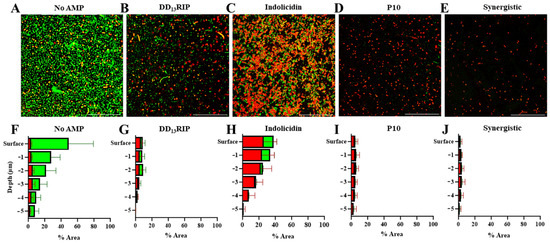 Investigation of MRSA cells interacting with AMP-hydrogels. Representative high-resolution (60× magnification) images of hydrogels tethered with (A) no AMP, (B) DD13RIP, (C) indolicidin, and (D) P10 at their soluble MIC, and (E) indolicidin and P10 at their synergistic soluble MIC. Scale bars: 100 µm. Quantitative spatial viability analysis of MRSA as a function of hydrogel depth of hydrogels tethered with (F) no AMP, (G) DD13RIP, (H) indolicidin, and (I) P10 at their soluble MIC, and (J) indolicidin and P10 at their synergistic soluble MIC.