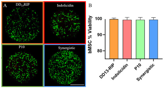 Mammalian MSC viability on AMP-loaded hydrogels. (A) Representative live–dead stain of MSCs seeded on AMP hydrogels at 2× MIC for each group. Scale bar: 1 mm. (B) Quantification of the viability of mammalian cells seeded on top of each AMP hydrogel. There were no significant differences in viability observed.