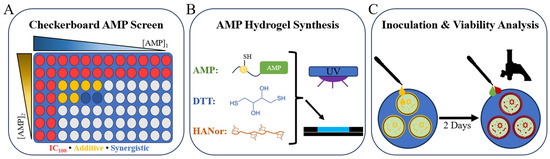 Schematic of the experimental design. (A) Diagram of 96-well plate array used for high-throughput screening of AMPs at different concentrations to determine additive or synergistic concentrations against MRSA and MSSA. Representative inhibitory (IC100), additive, and synergistic combinations are displayed. (B) Chemical components used to synthesize AMP hydrogels. (C) MRSA inoculation, incubation, staining, and imaging process diagram.