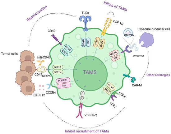 Immunotherapies targeting TAMs. Immunotherapies targeting TAMs have emerged as a potential strategy to enhance anti-tumor immune responses. There are three main categories involved in targeting TAMs: (1) Inhibition of macrophage recruitment: aims to prevent the recruitment of TAMs into the tumor microenvironment. It involves suppressing the production of chemokines like CCL2, CCL5, CXCL12, and their corresponding receptors such as CXCR4. Additionally, inhibition of VEGF formation can also prevent TAMs recruitment by reducing tumor angiogenesis; (2) Killing of TAMs: focuses on directly eliminating TAMs. One way to achieve this is by inhibiting the CSF1-R, which is vital for the survival and proliferation of TAMs. Blocking CSF1-R can lead to the depletion of TAMs within the tumor. The mechanism of action may be related to the activation of the PI3K-dependent pathway and the Ras/mediator-activated protein kinase-dependent pathway; (3) Reprogramming of TAMs into anti-tumor macrophages: aims to convert TAMs from a pro-tumor phenotype into an anti-tumor phenotype. It involves activating specific receptors on TAMs, such as CD40 and TLRs. The mechanism of CD40 can be related to NF-κB and the transcriptional activator STAT. The mechanism of TLR can be related to NF-κB and IRF signaling. Moreover, the binding of CD47 to SIRP-α leads to activation and phosphorylation of the SIRP-α ITIM matrix and recruitment of the SHP-1 and SHP-2 phosphatases, which inhibit the phagocytosis of tumor cells by preventing myosin IIA from aggregating at phagocytic synapses. Interfering with the SIRP-α-CD47 axis has been investigated as a way to restore the recognition and phagocytosis of tumor cells by TAMs. In addition, exosomes and CAR-M have also been studied recently. Exosomes are small vesicles that can be used to deliver therapeutic agents directly to TAMs, allowing targeted modulation of their functions. The mechanism of miRNA can be related to NF-κB and IRF signaling. CAR-M refers to genetically modified macrophages expressing chimeric antigen receptors, enabling them to recognize and eliminate tumor cells more effectively.