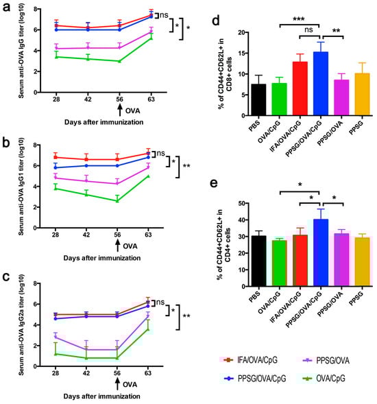 OVA–PPSG induces strong and persistent immune responses in mice. The serum titers of OVA-specific IgG, IgG1 and IgG2a were measured at day 28, 42, 56 and 63 after the first immunization and the results are presented in Figure (a–c) respectively. The percentages of CD44+CD62L+ cells among all CD8+T cells and of CD44+CD62L+cells among all CD4+T cells determined by flow cytometry are presented in Figure (d,e) respectively. Data are shown as mean ± SD (n = 3~5). Reprinted with permission from Elsevier, 2016 [28]. * p < 0.05, ** p < 0.01, *** p < 0.001, ns: not significant.