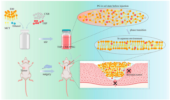 Wu et al. developed a PPSG system co-loaded with the antitumor agent pirarubicin (THP) and the cyclooxygenase-2 (COX-2) inhibitor celecoxib (CXB), which inhibits the postoperative recurrence and metastasis of breast cancer (Figure 7) [81]. After injection, the gel underwent a spontaneous phase transition and formed a drug reservoir that fitted the irregular surgical incisions perfectly. In vivo, the drug release was observed to last as long as 25 days for both THP and CXB. The in vivo therapeutic efficacy was evaluated in 4T1-bearing BALB/c mice. THP–CXB–IPG showed considerable inhibition of residual tumor growth after surgery and reduced the incidence of pulmonary metastasis. Moreover, it reduced the systemic toxicity of the chemotherapeutic agents.