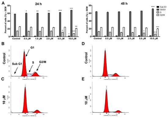 V9302 causes changes in the cell cycle distribution in MCF-7 cells. The figure represents the percentages of the different cell cycle phases after the 24 and 48 h treatment with V9302. Data presented are mean ± SEM, *, ** and *** indicate p < 0.05, p < 0.01 and p < 0.001, respectively, compared to control samples (A). Selected histograms exemplify the cell cycle disturbances caused by V9302 at different concentrations after 24 h (B,C) and 48 h (D,E).