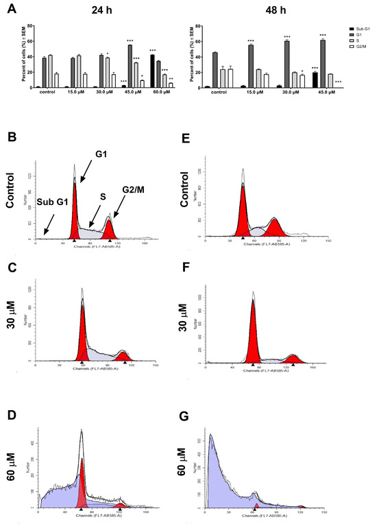 KCR cells were sensitive to the compound under the cytotoxic and antiproliferative IC50 values as well. The highest applied concentration induced substantial cell cycle disturbance and toxicity under the present conditions. After 24 h, the 60 µM test compound resulted in massive apoptosis in the entire cell population, and after 48 h, cell proliferation was completely blocked and a negligible number of cells could be collected (Figure 3). Elevated G1, suppressed S, and decreased G2/M could be detected in the resistant cell line. The subG1 population increased significantly in 45 µM concentration after 24 and 48 h (Figure 3).