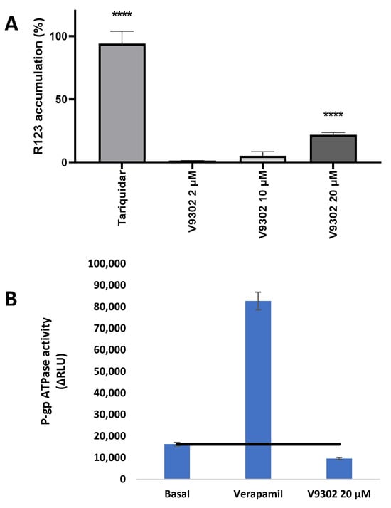 (A): Rhodamine 123 accumulation in Pgp-overexpressing mouse T-lymphoma cells in the presence of V9302 at 2, 10, and 20 µM (A). Tariquidar was used at 0.2 µM as a positive control. PAR cells represent 100% rhodamine 123 accumulation. (B): Pgp ATPase inhibition: V9302 was applied at 20 µM. ∆RLUTC > ∆RLUbasal: the tested compound (TC) is stimulator of Pgp ATPase activity; ∆RLUTC = ∆RLUbasal: the tested compound has no effect on Pgp ATPase activity; ∆RLUTC < ∆RLUbasal: the tested compound is an inhibitor of Pgp ATPase activity, black line represents the basal Pgp ATPase activity, **** indicates p < 0.0001.
