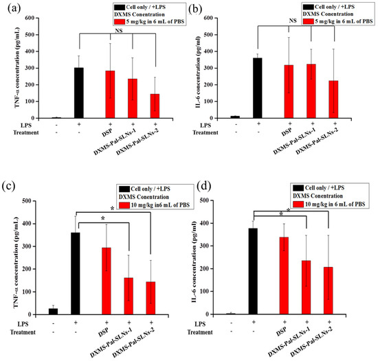 During acute infections, pathogens such as viruses and bacteria can rapidly replicate or proliferate, therefore eliciting a robust immune response from the host. Such immune responses may cause significant damage, in particular to the infected areas, and may ultimately lead to mortality. To evaluate the efficacy of DXMS-Pal-SLNs via the nebulization route under severe inflammatory conditions, pneumonia-related inflammation in mice was induced by LPS of the double dose (2.0 mg/kg) and treated with DXMS-Pal-SLNs via nebulization at a DXMS dose of 15 mg/kg. As shown in Figure 6a,b, both the levels of TNF-α and IL-6 became more erratic and fluctuating for all the groups with the LPS dose of 2 mg/kg being employed, probably being related to the development of the tolerance to LPS [49]. Nevertheless, DXMS-Pal-SLNs at the DXMS dose of 15.0 mg/kg exhibited the sound capability of lowering the TNF-α and IL-6 secretion induced by the overdose stimulation of LPS in contrast to the negligible anti-inflammatory effect by the DSP treatment via nebulization. The results suggest that nebulized DXMS-Pal-SLNs could be an effective therapeutic approach for acute infection treatment as they mitigate the harmful effects of the immune responses, mostly probably because of the enhanced cellular uptake of the SLNs by alveolar macrophages via phagocytosis.