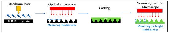 Researchers have used different types of lasers to fabricate microneedle arrays. Tu and Chung used a CO2 laser to fabricate microneedle molds by performing two casting processes. Also, the excimer laser has been studied to investigate the capability of producing microstructure arrays [43]. Further, Zheng et al. used femtosecond laser pulses to study the effects of two temperature conditions on the hole’s geometry [44]. However, this paper proposed a new laser type for manufacturing microneedle molds (arrays) for transdermal drug delivery applications. An ytterbium laser was used to create the microneedle molds with polymethyl methacrylate (PMMA) material due to its higher melting efficiency performed with lower power values [45]. Compared to CO2, ytterbium offers an advantage that includes effective interaction with the target, less energy consumption, and high productivity [46]. Compared to other types of lasers, the ytterbium laser offers a high optical quality, a compact size, an extended lifetime, and a flexible mode of operation [47].