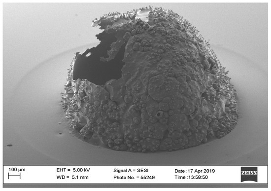 SEM image of a failed microneedle with parameters of triangle waveform and 40-watt laser power.