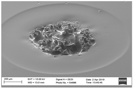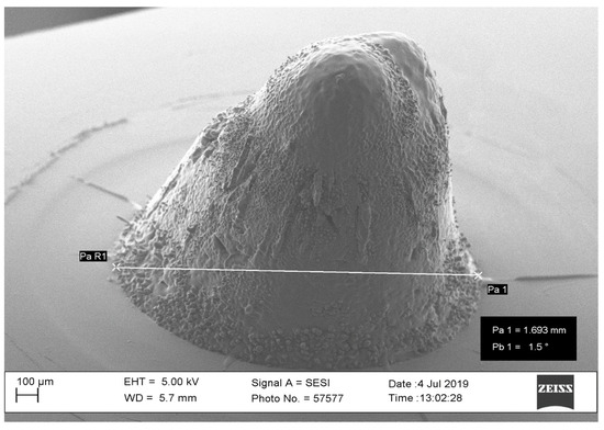 The laser power value should be in the range of 30 to 40 watts to obtain the desired outcomes for microneedles. Microneedle dimensions should range between 0.5 and 3 mm in height and 0.1 and 0.25 mm in width to be effective in therapeutics [56,57]. Power below 30 watts will not result in any holes and is considered too low to create a needle. Power above 40 watts will result in a large diameter (out-of-specification). Figure 4 shows a needle with a diameter of 1.69 mm created with 60-watt laser power. The laser power is to be used in conjunction with the laser waveform being implemented during microneedle fabrication. From our pilot study, it was revealed that a triangle waveform produced inconsistent microneedles and resulted in a shorter aspect ratio (height to diameter ratio). The trapezoidal and square waveforms that were considered for the final design of experiments were conducted at 30 W and 40 W powers. As higher powers beyond 40 W resulted in larger microneedles (beyond 2 mm in height) these are not effective for therapeutics.