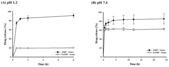 In vitro drug release of AMP-Sema and EAMP-Sema at (A) pH 1.2 and (B) pH 7.4 (mean ± SD, n = 3).