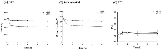 In both acidic and neutral conditions, the uncoated AMP-Sema displayed rapid drug release (Figure 2). Around 75% and 66% of the encapsulated drugs were released from AMP-Sema within 30 min at pH 1.2 and 7.4, respectively. In contrast, the coated EAMP-Sema showed a pH-dependent release rate. Around 20% and 62% of the encapsulated drugs were released from EAMP-Sema within 30 min at pH 1.2 and 7.4, respectively (Figure 2). This pH-dependent drug release property of EAMP-Sema was attributed to the surface-coated polymer’s solubility at pH 7.4. Accordingly, as shown in Figure 3, the size and surface charge of EAMP-Sema remained stable at pH 1.2, while undergoing significant changes at pH 7.4. These results are in accordance with previous findings [29,30,31,32]. For example, Tsai et al. [30] fabricated hyaluronan–cisplatin conjugate nanoparticles embedded in Eudragit S100-coated pectin/alginate microbeads, demonstrating that a Eudragit S100 coating suppressed drug release in acidic conditions while facilitating drug release at pH 7.4. In addition, previous studies [31,32] reported that the dissolution of Eudragit S100 at pH 7.4 led to a particle size reduction and alteration in the zeta potential.