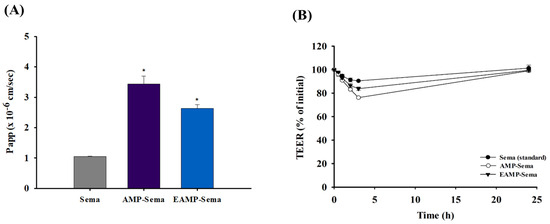 The impact of AMP-based nanoparticles on (A) the apparent permeability of semaglutide and (B) TEER values measured in Caco-2 cells (mean ± SD, n = 4). *: p < 0.05, compared to the control (free semaglutide).