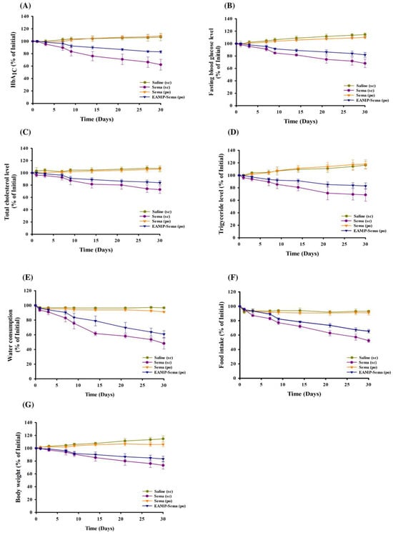 The impact of EAMP-Sema on glycemic control and weight loss of high-fat diet/streptozotocin-induced type 2 diabetic rats (mean ± SD, n = 6). Changes in various physiological parameters were assessed daily for 30 days: (A) glycated hemoglobin (HbA1c), (B) fasting blood glucose, (C) TC, (D) TG, (E) food intake, (F) water consumption, and (G) body weight. The administered doses were equivalent to 0.4 and 8 mg/kg semaglutide for subcutaneous injection and oral administration, respectively.