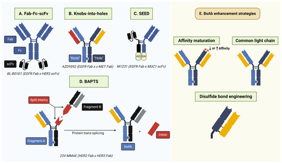 BsAb generation strategies. (A) Fab-Fc-scFv involves the fusion of Fab and scFv antibody fragments targeting separate antigens. Notably, the scFv region may be attached to regions other than those depicted above, such as the Fab N-terminus. (B) Knobs-into-holes require the incorporation of complementary “knob” (T366W) and “hole” (T366S; L368A; Y407V) mutations into the antibody CH3 region to facilitate heterodimerization. BsAbs may have common or different light chains. (C) Strand-exchange engineered domain (SEED) relies on the generation of CH3 domains with alternating IgG/IGA domains (“GA”/“AG”) that facilitate heterodimerization. SEED technology is also amenable to the incorporation of alternative antibody formats, such as scFv, as depicted above. (D) Bispecific Antibody by Protein Trans-Splicing (BAPTS) generates two antibody fragments fused to the split intein Npu DnaE. Following protein-splicing, the full-length intein is removed and the full-length bsAb is generated. (E) Common strategies to enhance bsAb efficacy, selectivity, and production include affinity maturation to alter antibody affinity for a target antigen and the incorporation of a common light chain or engineered cysteine/disulfide bond to eliminate heavy–light chain mispairing. Asterisks depict amino acid mutations in the complementarity-determining region.