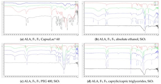 The formation of a supramolecular structure of ALA with caprylic/capric triglycerides filler is confirmed by FTIR spectra, as shown in Figure 2d. In the F5 and F8 spectra, characteristic peaks from ALA disappear and the formulation spectra are the same as caprylic/capric triglycerides filler. A characteristic peak at 1741 cm−1 from carbonyl C=O, as well as peaks at 1103 and 153 cm−1, originating from C–O–C ester group vibration, are present in the spectra of pure caprylic/capric triglycerides and both formulations F5 and F8.