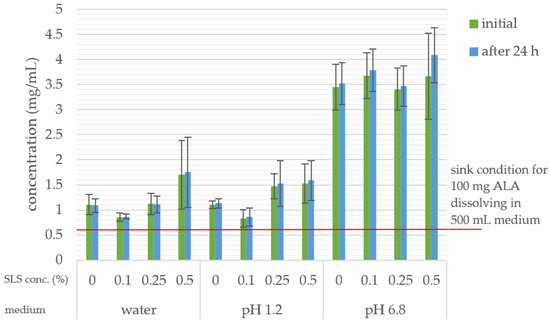 Additionally, though ALA’s lack of gastric stability has been implied in other studies [30,45], in our study ALA was stable in pH 1,2 medium at 37 °C with and without SLS (0.1%, 0.25%, and 0.5%) for 24 h. Also, ALA was stable at 37 °C for 24 h in water and pH 6.8 buffer, with and without SLS.