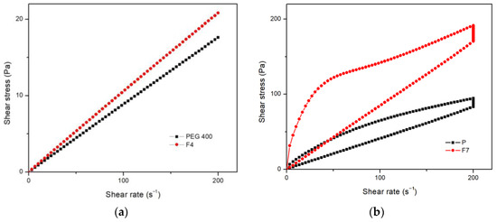 Rheograms of shear stress versus shear rate of (a) ALA solution in PEG 400 (F4) and pure PEG 400; (b) ALA silicon dioxide gel formulation in PEG 400 (F7) and corresponding placebo formulation without ALA (P).
