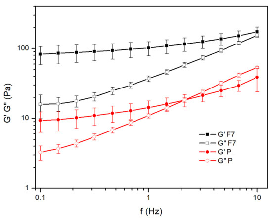 In the placebo gel formulation, which consisted only of PEG 400 and silicon dioxide (P), G′ dominates over G″ at low frequencies. The cross-over at about 2.15 Hz occurs and after that, G” continues to be dominant. In the semisolid formulation with ALA (F7), G′ is more pronounced compared to G″ for the entire observed range of frequencies (Figure 6).