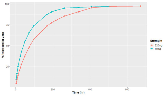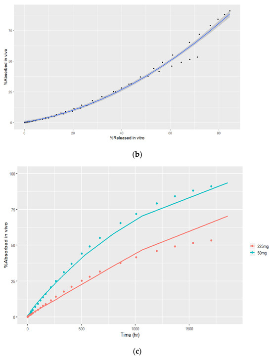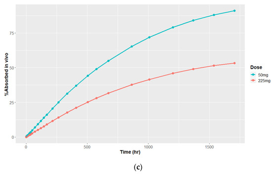 The obtained IVIVC model (Equation (4)) was used to compute the in vivo percent absorbed values based on in vitro percent released and predicted values were compared with observed ones. As seen in Figure 6c, the predicted profile was very similar to the observed one for the 50 mg dose. However, the terminal portion of the 225 mg profile was slightly overestimated by the model as a result of the lack of fit of the terminal portion observed in the correlation plot.