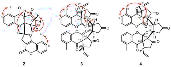 Figure 3. Key NOESY correlations () of compounds 2, 3, and 4.