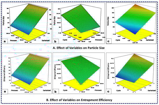Three-dimensional response surface plots showing the influence of surfactant concentration (a), HPH pressure (b), and HPH cycles (c) on the CQAs, viz., the particle size (A) and entrapment efficiency (B) of the NLCs.