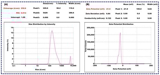The optimized batch of NLCs exhibited promising characteristics and showed a mean particle size of 232 ± 23 nm (Figure 2A), indicating their nano-scale nature. Furthermore, the polydispersity index (PDI) was measured at 0.514 ± 0.13, suggesting a relatively narrow size distribution, which is crucial for uniform drug delivery. Moreover, the zeta potential was recorded at −21.9 ± 2.1 mV (Figure 2B), which falls within the optimal range of −30 mV to +30 mV for colloidal stability. The zeta potential is due to the combined effects of GMS, Oleic acid, and Tween 80. GMS provides structural integrity and amphiphilic characteristics, Oleic acid contributes negatively charged carboxylate ions, and Tween 80 offers steric stabilization. These components work synergistically to stabilize the NLCs and prevent aggregation, ensuring a stable and effective drug delivery system. These findings are pivotal for enhancing drug encapsulation efficiency, sustained release, and overall therapeutic efficacy [21,44].