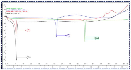 Overlay of DSC thermograms for (A) Apixaban, (B) GMS, (C) physical mixture of Apixaban and GMS, and (D) Apixaban-loaded NLCs.