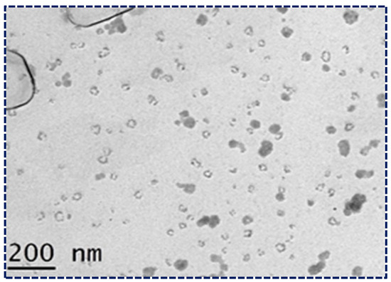 The surface morphology of the optimized NLCs was studied using transmission electron microscopy (TEM) (Figure 4). The TEM image provided critical insights into the structural characteristics of the NLCs. The image showed that the NLCs had a spherical morphology with a uniform size distribution and no agglomeration, indicating that the formulation process was successful in producing stable NLCs. Additionally, the size of the NLCs was consistently below 200 nm, which is crucial for enhancing bioavailability and ensuring efficient drug delivery. These characteristics, observed in the TEM images, confirm that the NLCs possess the desired properties for potential therapeutic applications. The spherical shape and uniform size distribution contribute to the stability and predictability of the NLCs’ behavior in biological systems, further validating their suitability for the present study. This detailed examination of the TEM images underscores the importance of morphological analysis in the development and optimization of NLC formulations [47].