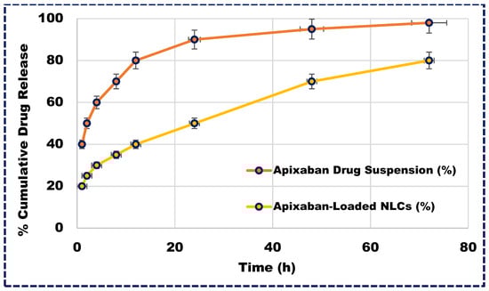 The timely release of an entrapped drug is a critical step in the formulation development of a novel dosage form. Various factors such as the structure and composition of the nanolipoidal carrier have a significant impact on the pattern of drug release. Therefore, it was investigated exactly how Apixaban was released from the NLCs in vitro. Optimized Apixaban NLCs were tested for drug release in phosphate buffer solution (PBS, pH 6.8) utilizing the dialysis bag method [32]. The dialysis bag method was chosen for its simplicity and effectiveness in providing a controlled environment for studying the release kinetics of the drug from the developed NLCs. This method allows for the continuous monitoring of drug release and helps in understanding release mechanisms, which are critical for predicting the in vivo behavior of the drug-loaded NLCs. The dialysis bags (molecular weight cut-off: 12–14 kDa) were prepared by soaking them overnight in distilled water to remove any preservatives and ensure proper hydration. Each bag was then filled with 2 mL of the NLC dispersion and sealed at both ends. The sealed dialysis bags were immersed in phosphate-buffered saline at 37 ± 0.5 °C and subjected to magnetic agitation at 50 rpm. At predefined intervals up to 72 h, 0.5 mL of the solution was withdrawn and filtered using a 0.22 µm filter (Millipore, Burlington, MA, USA). A fresh buffer solution was added to maintain sink conditions. The filtrates were diluted and analyzed using a UV spectrophotometer at 278 nm [33,34,35].