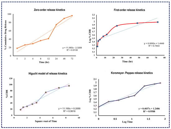 The subsequent analysis using various release kinetics models, as illustrated in Figure 6, revealed R-squared values for several models including the Higuchi model (R2 = 0.9616), Korsmeyer–Peppas model (R2 = 0.9588), first-order kinetic model (R2 = 0.7843), and zero-order kinetic model (R2 = 0.9138). The high R-squared value of the Higuchi model suggests that drug release from NLCs follows a diffusion process, indicating a split into immediate and prolonged release phases [50].
