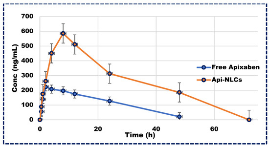 Following a single dose of Apixaban NLCs, plasma concentrations of the drug remained above therapeutic levels for 72 h, in contrast to the rapid excretion of the free drug within 24 h, as illustrated in Figure 7. The pharmacokinetics parameters of Apixaban NLCs are represented in Table 4, exhibiting significantly different Cmax and Tmax values compared to the free drug in plasma profiles. Moreover, the total elimination rate constant (Kele) for the free drug exceeded that of the NLCs, leading to a greater half-life (t1/2) for Apixaban NLCs. Additionally, the area under the curve (AUC0–∞) was markedly higher for Apixaban NLCs (p < 0.001) compared to its free form. This significant improvement in the pharmacokinetics of Apixaban NLCs may be attributed to the nano-sized particle’s ability to bypass the lymphatic system, thereby circumventing first-pass metabolism and prolonging drug exposure, emphasizing the therapeutic potential of NLC-based delivery systems [51,52].