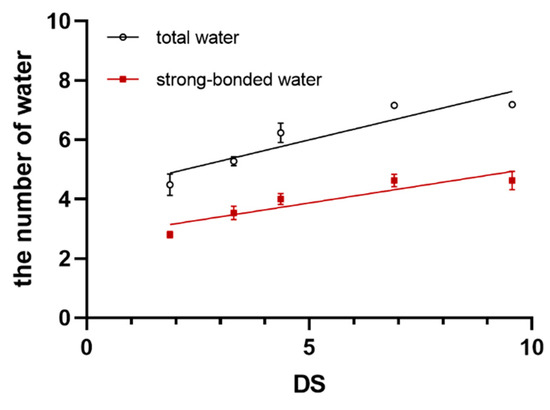 KFT was used to determine the water content and SBW content of SBE-β-CDs (DS ≈ 2, 3, 4, 7, 10). Based on the average molecular weight, the average number of water molecules and SBW molecules per SBE-β-CD molecule can be calculated (refer to Table 2 and Figure 2). For SBE-β-CD with DS around 2, 3, 4, 7, and 10, the total number of water molecules is approximately 4.49, 5.38, 6.24, 7.16, and 7.19, respectively. The corresponding numbers of SBW molecules for SBE-β-CD with DS approximately 2, 3, 4, 7, and 10 are 2.80, 3.54, 4.00, 4.63, and 4.63, respectively. Analysis of variance (ANOVA) on this result showed significant differences (p < 0.05) in the total number of water molecules and SBW molecules among SBE-β-CDs with different DS. This indicates that SBE-β-CDs with different DS exhibit variability in the number of total water molecules and SBW molecules.