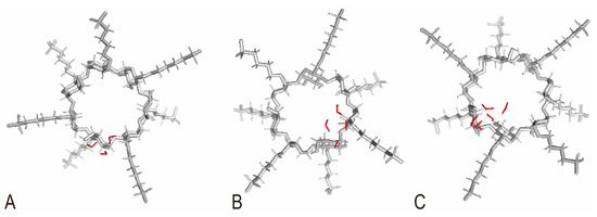 The positions of SBW within SBE7-β-CD: (A) SBE7-β-CD + 3H2O; (B) SBE7-β-CD + 4H2O; (C) SBE7-β-CD + 5H2O.