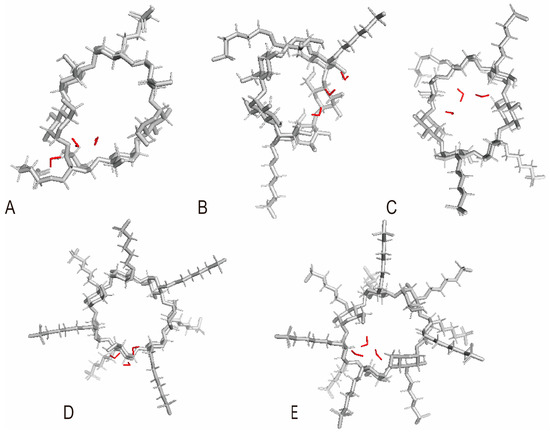 The positions of SBW molecules within SBE-β-CD with varying DS: (A) SBE2-β-CD + 3H2O; (B) SBE3-β-CD + 3H2O; (C) SBE4-β-CD + 3H2O; (D) SBE7-β-CD + 3H2O; (E) SBE10-β-CD + 3H2O.